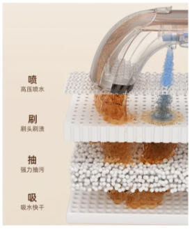 布藝清洗機是通過高壓噴射的冷熱水流,強力溶解布藝家具上的頑固污漬,然后再通過布藝清洗機的刷頭將軟化的污漬刷洗,最后再將臟污通通吸入的設(shè)備,簡單理解就是噴刷抽吸完成布藝清洗。