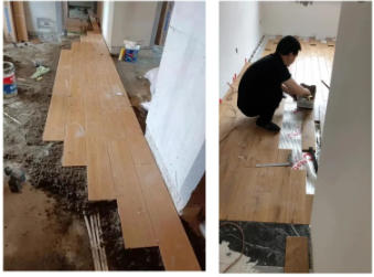 在鋪貼木紋磚之前,先對(duì)地面進(jìn)行找平處理,用半濕的水泥沙進(jìn)行混合并且在地面鋪平整。